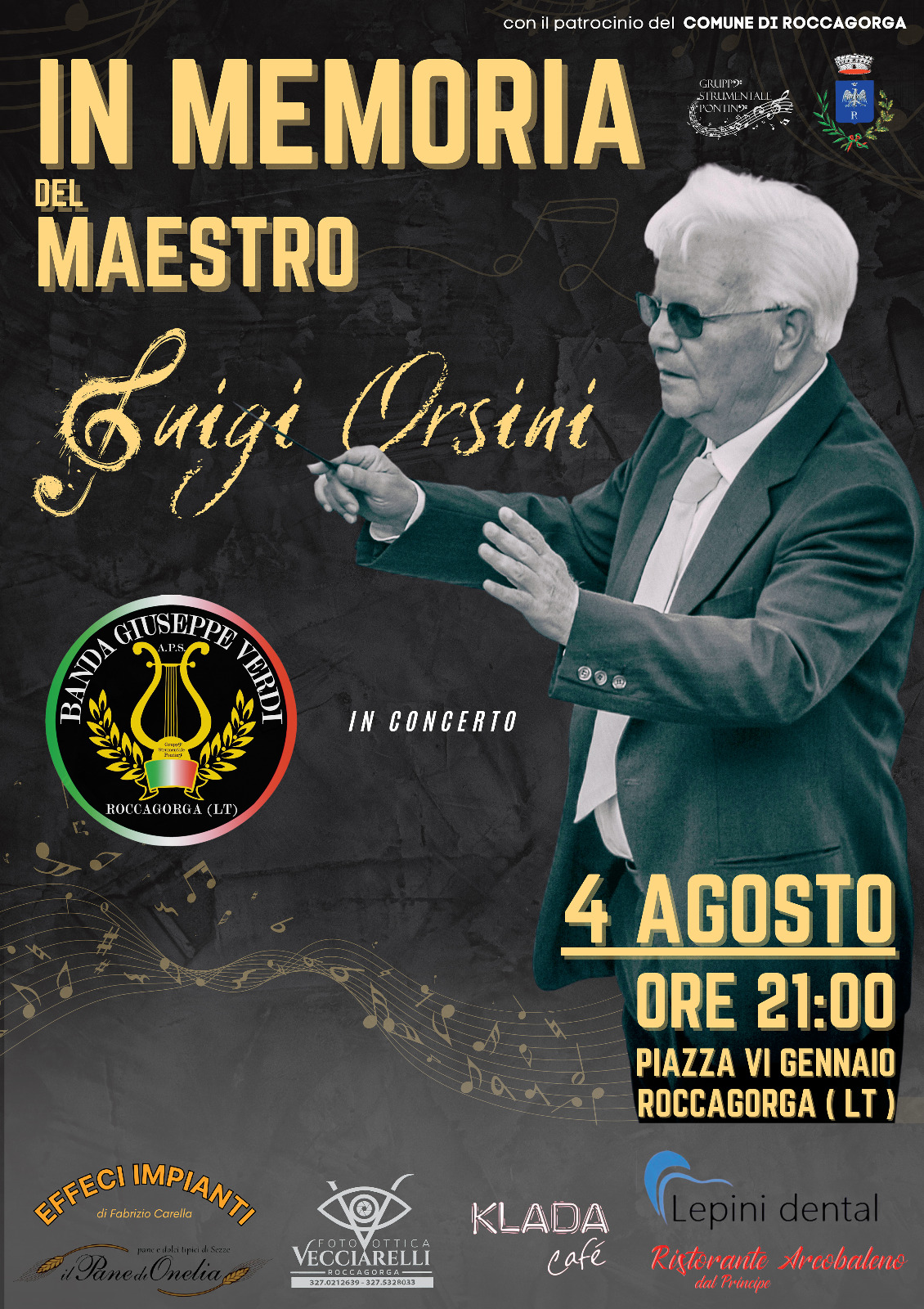 La APS gruppo strumentale pontino è lieta di presentare l’evento che si terrà il 4 agosto alle ore 21.00 in piazza a Roccagorga, organizzato in memoria del Maestro Luigi Orsini, scomparso circa un anno fa. Insegnante di musica nelle scuole medie, direttore della banda musicale di Roccagorga, compositore e autore di marce e marce sinfoniche, da sempre apprezzato e stimato da tutti, Luigi Orsini ha trasmesso la sua passione a tanti ragazzi nel corso di mezzo secolo. Ha svolto nella comunità un importante ruolo, sociale, culturale ed educativo, sempre con grande umiltà, quasi fosse inconsapevole della preziosa eredità diffusa che stava lasciando.