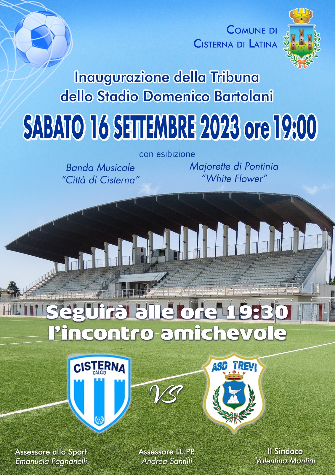 Si inaugurerà, pertanto, sabato prossimo, 16 settembre alle ore 19, la tribuna – e con essa tutte le altre strutture precedentemente non a norma – dello Stadio Bartolani, finalmente restituito funzionante e sicuro alla comunità di Cisterna. Dopo un intervento di saluto da parte del sindaco Valentino Mantini e dell’assessora alla Sport Emanuela Pagnanelli, ci sarà l’esibizione della Banda musicale “Città di Cisterna” e delle majorette “White Flower” di Pontinia. Seguirà, alle 19.30 l’incontro amichevole tra il Cisterna Calcio e l’A.S.D. Trevi.