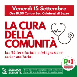 Si va concludendo l’iniziativa dell’estate militante del Partito Democratico. Uno degli ultimi appuntamenti è fissato per venerdì 15 settembre, quando a Sezze ci sarà un confronto sul tema che riguarda “La cura della comunità. Sanità territoriale e integrazione sociosanitaria”.