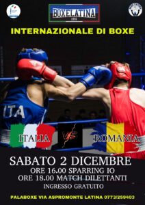 Sabato 2 dicembre suona il gong del grande pugilato al PalaBoxe Città di Latina. La Boxe Latina ha organizzato la sfida internazionale per club tra Italia e Romania. Ingresso gratuito in via Aspromonte. Alle 18 il gong della riunione mista con atlete e atleti. Saranno dodici i match nelle categorie Schoolgirl, Schoolboy, Junior ed Elite. Si va dai 48 ai 75 chilogrammi. In alcuni casi gli abbinamenti saranno tra pugili italiani, provenienti dal Lazio, Campania, Puglia e Piemonte. Tra i maestri all’angolo anche “Sparviero” Patrizio Oliva. L’atmosfera delle grandi attese si avverte nelle parole del presidente Maria Stella Prezioso: “Continua la crescita sia come società, che dei nostri ragazzi. E’stato organizzato un altro grosso evento che nasce dai rapporti consolidati anche con le Federazioni estere. Il nostro lavoro negli anni a livello di settore giovanile e agonistico è stato apprezzato e questi sono i risultati”.