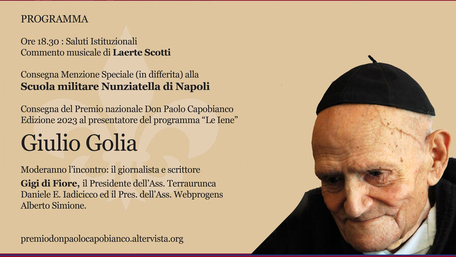 Quest’anno, il Premio Don Paolo, confezionato dal maestro Massimo Patroni Griffi, verrà assegnato al giornalista e conduttore del programma televisivo “Le Iene”, Giulio Golia, e consegnato dal Sindaco di Gaeta, Cristian Leccese. Dialogheranno con l’ospite, il giornalista e scrittore Gigi Di Fiore e i presidenti delle associazioni promotrici, Daniele Elpidio Iadicicco e Alberto Simione.