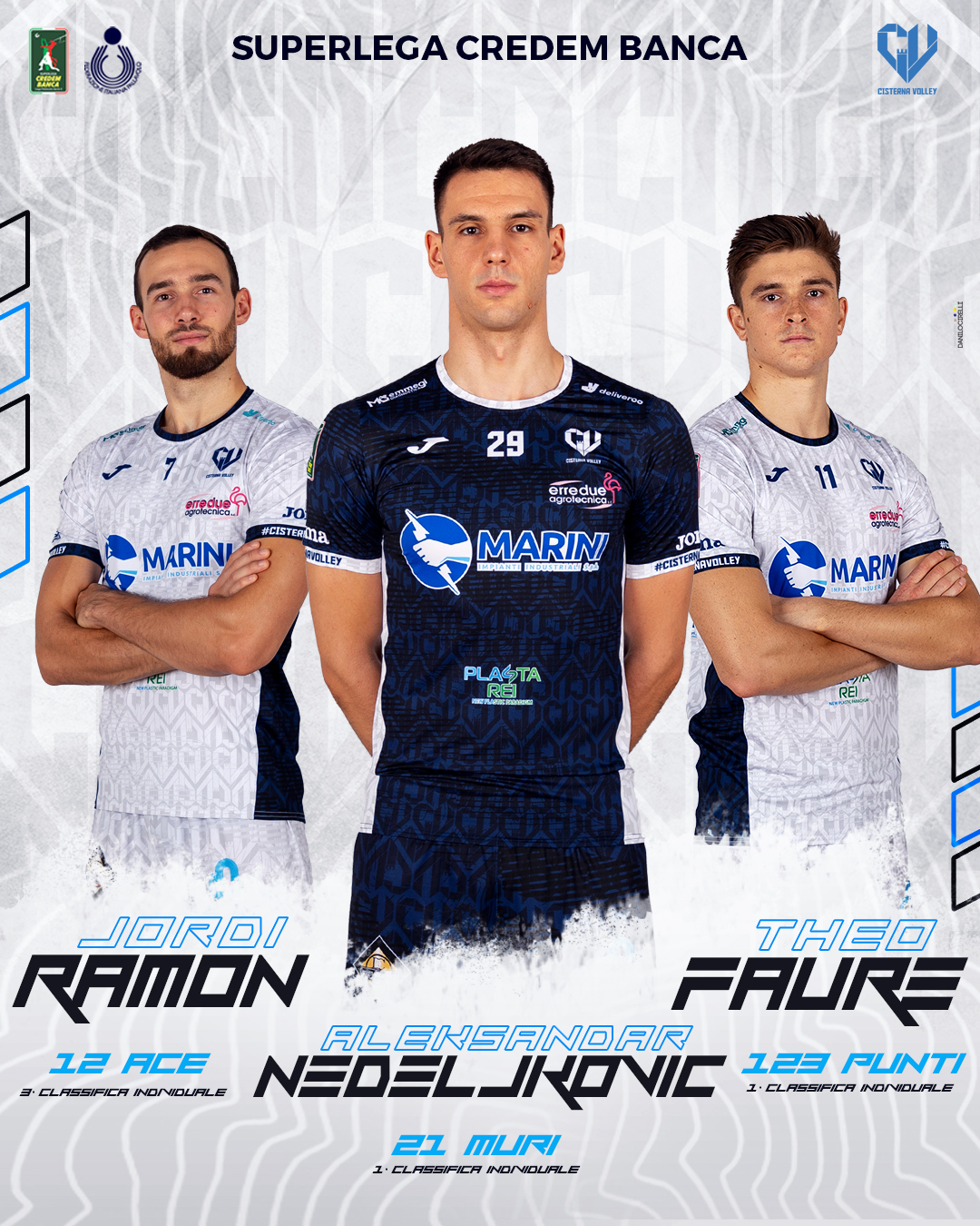 Il Cisterna Volley è stata anche la squadra che ha ottenuto il maggior numero di muri punto (15) nell’ultima giornata e tra i top della Superlega c’è il centrale serbo Aleksandar Nedeljkovic che è stato il migliore con ben cinque block vincenti. Proprio Nedeljkovic è il leader nella classifica dei muri punto di tutta la Superlega: sono stati 21 quelli realizzati finora dal centrale della formazione pontina, davanti ai 16 block della coppia composta da Sebastian Solè (Perugia) e Marko Podrascanin (Trento). Lo spagnolo Jordi Ramon è invece terzo nella graduatoria degli aces: 12 punti dalla linea dei nove metri per il martello pontino alle spalle di Garcia Fernandez (Padova) con 14 e Takahashi Ran (Monza) con 13.