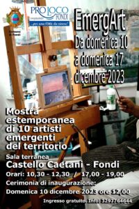 Nella suggestiva sala terranea del Castello Caetani per un’intera settimana verrà allestita la mostra di pittura dal titolo: “EmergArt”, dedicata all’esposizione delle opere di dieci talentuosi artisti emergenti del territorio.