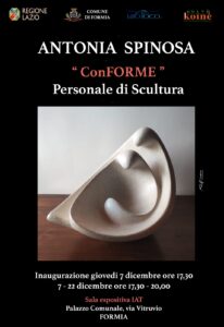 Sarà presentata giovedì 7 dicembre alle ore 17.30, presso lo Spazio Espositivo del Punto IAT del Palazzo Comunale, “ConFORME”, la mostra personale di Scultura di Antonia Spinosa. L’evento è inserito nel progetto “Sentieri d’Arte” proposto dall’associazione Koinè Salottoculturale in collaborazione con lo IAT e il Comune di Formia. La scultura di Antonia Spinosa rappresenta una logica conclusione di una linea di esplorazione della forma, sempre morbida e arrotondata, interamente liscia senza dettagli per disturbare la superficie modellata. Appare efficace la capacità di sintesi nei confronti dei soggetti scolpiti, dai quali astrae volumi e tratti in una versione assolutamente contemporanea delle arti scultoree a cui si ispira per riportare i suoi lavori a forme assieme essenziali e organiche, esaltando al contempo le qualità estetiche dei materiali utilizzati, modificati in curve lisce e levigate. I soggetti rappresentati presagiscono la figura ma non la ritraggono. Le sue opere prediligono i gruppi scultorei ma non disdegna la forma monolitica nella quale spesso convivono più presenze solo accennate. Il corpo della figura umana subisce una sorta di accenno alla rotazione che dispiega più apertamente alla ricerca di una maggiore compenetrazione tra i pieni e i vuoti dello spazio circostante. Nelle sue sculture mostra l’avvio di processi di svuotamento della figura femminile e maschile e di evidenziazione degli elementi strutturali del corpo, attraverso torsioni e relazioni tra interno ed esterno. Ammirare la sua arte significa esplorare superfici e contenuti ispiratori della scultura contemporanea da Brancusi a Moore senza peraltro dimenticare la lezione del passato e del concetto di armonia tanto caro al Classicismo.