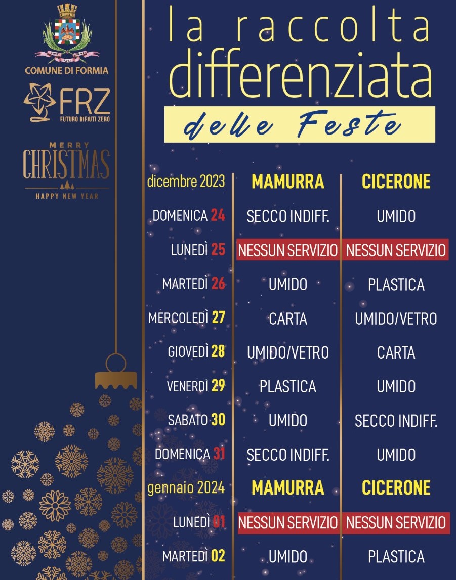 Per garantire il funzionamento delle attività da parte degli operatori della Frz, il servizio previsto per le giornate di Natale e Capodanno sarà anticipato per cui il secco residuo in zona Mamurra e l’organico in zona Cicerone saranno raccolti le domeniche del 24 e del 31 dicembre 2023, anziché nei giorni di lunedì 25 dicembre e del primo gennaio 2024.