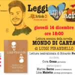 Giovedì 14 dicembre alle ore 18 presso lo spazio MAD di via Cattaneo,5 nell’ambito della rassegna: “Leggiamo la città” promossa dall’associazione Articolo21 – presidio di Latina, verrà presentata la lettura scenica di Edoardo Feola della novella “Mondo di carta” del premio Nobel per la letteratura Luigi Pirandello. Insieme all’attore intervengono Marisa Sarno docente di letteratura italiana. Lina Maietta, psicologa – psicoterapeuta. Responsabile UOS “Sostegno alla genitorialità e percorso giovani” presso l’Asl di Latina. Modera la giornalista Cora Craus.