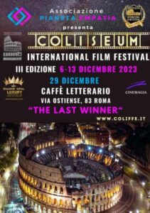 Dal 6 al 14 dicembre tutte queste opere sono state proiettate online 24 ore su 24 su due canali web, Coliffe Tv e Coliffe Tv International, per essere votate dalla giuria online, e registrando oltre 3.000 spettatori e oltre 4.500 votanti le opere nazionali e oltre 1.500 votanti le opere internazionali. Il sito, www.coliffe.it, ha registrato, nell’ultima settimana, ben 45.000 visitatori. Il 29 dicembre Roma non sarà solo la città del Papa: sarà la città del cinema. Dalle ore 16:00 al Caffè Letterario di Via Ostiense, il Coliseum International Film Festival, l’ultimo festival cinematografico dell’anno, proietta le opere vincenti e premia gli ultimi vincitori dell’anno (60 suddivisi fra i 9 concorsi) con gli awards “The Last Winner”. Fra i premiati ci saranno personaggi famosi ed affermati, come Maurizio Mattioli, Patrizia Pellegrino, Fabio Fulco, Janet De Nardis, Demo Morselli, Marisa Laurito, Paola Lavini, Sergio Cammariere, Claudio Bucci, Nicola Nocella, il compianto Blasco Giurato, e registi ed attori/attrici emergenti come Charles Guerin Servillle, Daniele Gangemi, Angelica Cacciapaglia, Inessa Gordeiko, Joe Palermo, Bob Caprai, Roberto Pili, Matteo Carucci, Davide Como, Gabriel Carlevale, Irene Magnani, Roberto Di Fabio, Silvia Siravo e Sara Corbioli, senza tralasciare i premiati stranieri come Susan Hoecke, Pierre-Marie Personnier, Timothy Mark Friend, Rui Cunha Pereira, Nico Falcone Georgiadis, Anaïs Gasparini, Maryam Rahimi, Gail Malbete e tanti altri. Il Festival è Organizzato e curato dall’APS PIANETA EMPATIA, sotto la Presidenza di Giuseppe Cuscusa e la Direzione Artistica di Elisabetta Pellini. La serata finale del 29 dicembre sarà presentata da Emanuela Tittocchia. Poi arrivederci al 5 dicembre 2024 per la quarta edizione di COLIFFE.