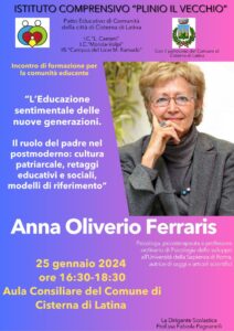 Giovedì 25 gennaio 2024, alle ore 16.30, presso l’Aula Consiliare del Comune di Cisterna di Latina, l’Istituto Comprensivo “Plinio il Vecchio” ospiterà la prof.ssa Anna Oliverio Ferraris, tra i massimi esperti di psicologia dello sviluppo, psicoterapeuta e già professore ordinario di psicologia dello sviluppo all’Università “La Sapienza” di Roma. L’incontro, dal titolo “L’educazione sentimentale delle nuove generazioni. Il ruolo del padre nel postmoderno: cultura patriarcale, retaggi educativi e sociali, modelli di riferimento”, affronterà il tema della genitorialità, con un approfondimento tematico sull’educazione sentimentale delle nuove generazioni e focus specifico sulla figura del padre nella contemporaneità. L’evento è stato organizzato dalla docente Sabrina Domini, autrice, consulente didattica ed esperta di letteratura dell’infanzia, ed è inserito all’interno del Patto Educativo di Comunità, promosso dal Comune di Cisterna (Assessorati alla Scuola e allo Sport, alle Politiche Giovanili e dell’Infanzia e alla Cultura) e sottoscritto da tutti i Dirigenti Scolastici locali.