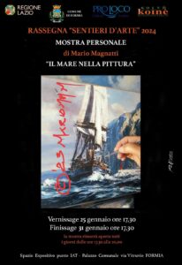 L’evento è il secondo inserito nella rassegna “Sentieri d’Arte 2024”, promossa dall’associazione culturale Koiné in collaborazione con l’Ufficio informazioni e accoglienza turistica e l’Assessorato alla Cultura e al Turismo del Comune di Formia. Il Vernissage è previsto per le ore 17:30 del 25 gennaio, il finissage per la stessa ora del 31 gennaio. MARIOM, questo il nome d’arte di Mario Magnatti, espone nella mostra una serie di opere legate all’immaginario del mare, protagonista o scenario di svolgimento di eventi. Le imbarcazioni compaiono a sottolineare la differenza tra cielo e mare e si fanno punto di riferimento per misurare la distanza che le separa dall’orizzonte. Isolate o in coppia diventano soggetti viaggianti, attraversano uno spazio d’acqua spumeggiante e di vento che i colori riescono a rendere verosimili grazie all’uso sapiente della luce che interviene ad orientarne l’intensità cromatica e a definirne le forme.