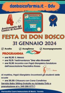 La comunità del Cuore Immacolato di Maria di Formia festeggia San Giovanni Bosco, patrono della gioventù. Oggi, giorno della nascita al cielo di don Bosco (31 Gennaio 1888), dopo la celebrazione eucaristica delle ore 18.30 ci sarà la condivisione della testimonianza di un giovane sposo che, anche grazie all’aiuto del Centro di Ascolto parrocchiale, si sta liberando dalla dipendenza da alcol. Mentre alle ore 19.30 in Auditorium papà Gianpietro incontrerà tutti gli adulti che vorranno partecipare. La conclusione della giornata avverrà con la condivisione della cena per tutti i presenti, sempre in Auditorium. Gianpietro Ghidini, detto papà Gianpietro, è fondatore dell’Associazione Ema PesciolinoRosso e da anni opera nel territorio nazionale incontrando scuole, giovani e famiglie. All’evento sono state invitate tutte le scuole medie e superiori del territorio. Oggi papà Gianpietro incontrerà i ragazzi delle scuole secondarie Dante e Mattej di Formia, due classi dell’istituto Nautico di Gaeta, due dell’Istituto Fermi-Filangieri e quattro del Liceo Scientifico di Minturno. Il servizio di regia e comunicazione social dell’Oratorio resta a disposizione di quanti vorranno interagire da remoto nell’incontro.