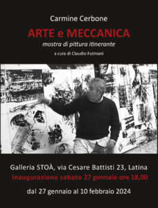 Sarà inaugurata sabato 27 gennaio alle 18 la mostra di pittura itinerante ARTE e MECCANICA dell’artista pontino Carmine Cerbone a cura di Claudio Futmani. L’esposizione, presso la Galleria STOÀ, in Via Cesare Battisti 23 a Latina, sarà visitabile fino al 10 febbraio.
