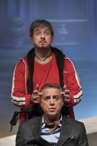 E un altro uomo che entra ed esce di galera, sin da ragazzino, svelto, con una sua intelligenza vivace e una cultura fatta sulla strada e nei film di serie b, che ha visto. Un uomo che preferisce porre il suo corpo avanti a tutto e lasciare il cervello quieto nelle retrovie. Un corpo che, da subito, ha cercato di farsi strada nelle periferie degradate, in cui un’incertezza diventa come in natura, essenziale per determinare il proprio posto nella catena alimentare. Un predatore che in realtà è una preda delle proprie debolezze. “Per la regia mi sono immaginato un grande spazio aperto, un grande panorama illuminato come una giornata estiva, una notte autunnale, un pomeriggio piovoso. E un piano inclinato che dirada verso il proscenio e che racchiuda al suo interno tutti i luoghi della vicenda, che si aprono e diventano a volte studio, camera da letto, salotto, a volte ristorante eccetera. Ma poi richiudendosi all’interno del praticabile ci restituiscono solo una pianura inclinata in cui far scivolare dolcemente la sedia a rotelle o faticosamente spingerla in salita. Un non luogo esterno che potrebbe essere una spiaggia con il mare davanti, la platea, o un prato dove volano i parapendii e dove nel finale, per realismo magico, seguendo un aquilone che Driss fa volare nel vento di un pomeriggio, Philippe finalmente acquisisce la sua leggerezza e si stacca dalla sua sedia a rotelle e vola come se fosse sul parapendio lasciando finalmente quella sedia che lo schiacciava verso la gravità più pesante del mondo. Philippe ha perso la gravità. Ha imparato la leggerezza e Driss, la leggera profondità che non lo fa volare e tiene Philippe ancorato a sé, come un riferimento importante. La loro amicizia, una centratura, per vivere ed essere uomini un po’ più consapevoli della meraviglia e poter ridere, finalmente a crepapelle”, racconta il regista Alberto Ferrari.