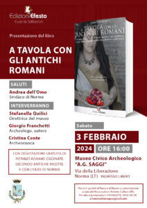 Sabato 3 febbraio alle ore 16,00, presso il Museo Civico Archeologico “A.G. SAGGI” di Norma (LT) si terrà la presentazione del saggio “A TAVOLA CON GLI ANTICHI ROMANI”, del divulgatore storico Giorgio Franchetti.