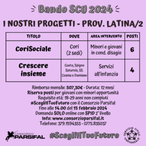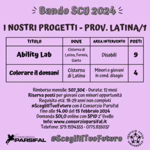 I progetti per Latina e provincia riguardano gli ambiti dell’assistenza ai bambini, ai giovani, agli adulti in condizioni di svantaggio e alle persone con disabilità, oltre che dell’educazione e dell’animazione per bambini. Per quanto riguarda le attività in provincia di Latina – da realizzare presso le Cooperative Altri Colori, Herasmus e Osiride e presso il Comune di Cori – sono disponibili 8 posti a Cisterna di Latina, 6 a Cori, 5 a Gaeta, 3 a Formia, 1 a Santi Cosma e Damiano, 1 a Spigno Saturnia: i giovani selezionati presteranno servizio in centri socio-educativi per minori, centri diurni per disabili, una casa famiglia per disabili, i nidi d’infanzia di Gaeta, Spigno Saturnia e SS. Cosma e Damiano e presso i Servizi Sociali comunali a Cori. Tutti i progetti del Consorzio Parsifal prevedono inoltre una quota di posti riservati per giovani con minori opportunità (e precisamente in difficoltà economiche, ovvero giovani con ISEE inferiore a 15.000€).