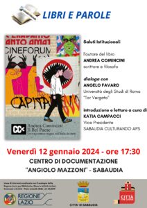 Venerdì 12 gennaio alle ore 17:30 nel Centro di Documentazione “Angiolo Mazzoni” si svolgerà il secondo appuntamento della rassegna “Libri e Parole” organizzata dal Comune di Sabaudia in collaborazione con “Sabaudia Culturando APS” e realizzata grazie al sostegno della Regione Lazio per Biblioteche, Musei e Istituti similari, Ecomusei e Archivi – Piano Annuale 2023, L.R. 24/2019.