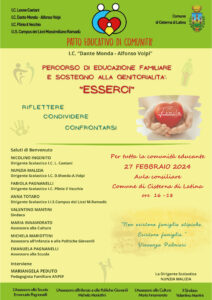 Porteranno i saluti Nicolino Ingenito dirigente scolastico I.C. L. Caetani, Nunzia Malizia dirigente scolastico I.C. D.Monda-A.Volpi, Fabiola Pagnanelli dirigente scolastico I.C. Plinio il Vecchio, Anna Totaro dirigente scolastico I.I.S.Campus dei Licei M.Ramadù, il sindaco Valentino Mantini, l’assessora alla Cultura Maria Innamorato, l’assessora all’Infanzia e alle Politiche Giovanili Michela Mariottini, l’assessora alla Scuola Emanuela Pagnanelli. «La corresponsabilità tra Scuola e genitori per l’educazione delle nuove generazioni è tra i principi fondamentali espressi dalla Costituzione – si legge nel progetto “Esserci” – . Il percorso alla genitorialità ha l’obiettivo di partire dalla conoscenza di sé, per arrivare, attraverso le varie tappe della vita genitoriale, a produrre efficaci interventi educativi. “Esserci” è ideato per coloro che rivestono una responsabilità genitoriale, vuole superare l’idea di un percorso da seguire come “dovere” quanto piuttosto un tempo volto all’arricchimento personale, al dialogo e all’ascolto attivo in un’ottica di confronto non giudicante, neutrale e tollerante».