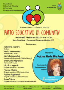 Mercoledì 7 febbraio alle ore 16.30 in Aula consiliare si terrà la presentazione per il Patto Educativo di Comunità della città di Cisterna di Latina. Interverranno il sindaco Valentino Mantini, l’assessora alla Cultura Maria Innamorato, l’assessora all’Infanzia e alle Politiche Giovanili Michela Mariottini, l’assessora alla Scuola Emanuela Pagnanelli, i dirigenti scolastici Nicolino Ingenito dell’I.C. L.Caetani, Nunzia Malizia dell’I.C. D.Monda-A.Volpi, Fabiola Pagnanelli dell’I.C. Plinio il Vecchio, Anna Totaro dell’I.I.S Campus dei Licei M.Ramadù.