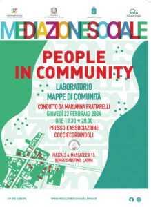 Domani 22 febbraio, dalle ore 18:30 alle ore 20, nella sede dell’associazione dei promozione sociale “Cocci e Coriandoli” di Claudia Piccoli presso piazzale A.Massaccesi 13, a Borgo Sabotino, si terrà il primo incontro del laboratorio “Mappe di comunità” condotto da Marianna Frattarelli.