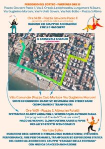 Il corteo partirà alle ore 15,00 da Piazza Giovanni Paolo II (antistante all’Istituto delle Suore Orsoline), sarà vivacizzato da street band, Cromosauro e trampolieri e, verso le 16,00, raggiungerà Piazza S. Albina (Rotelli), dove si terrà uno spettacolo di arte varia con il ventriloquo Antonio Diana (dal programma di Canale 5 “Tu sì que vales”), Mago Alivernini, Clowndestini Julius & Pipos, dee-jay ed effetti scenografici.