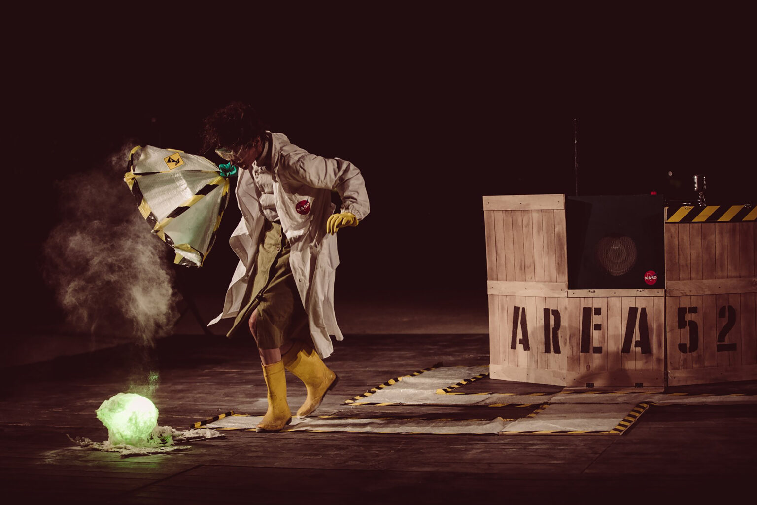 Il Theremin è uno strumento elettronico poco conosciuto dal grande pubblico che ha una particolarissima specificità: non prevede il contatto fisico dell’esecutore con lo strumento. Vedere un suonatore di theremin è un’esperienza magica e misteriosa: lo si osserva fare degli strani movimenti nell’aria e si sente un suono simile a un violino. Quello che succede in realtà è che il movimento delle mani del musicista (ma potrebbe essere quello di qualsiasi oggetto fatto di materiale conduttore) interagisce con i campi elettromagnetici che si formano intorno alle antenne del theremin, dedicate l’una all’intensità e l’altra all’altezza dei suoni. Un’interessante curiosità è che se pochi sanno come sia fatto e come funzioni un theremin, moltissimi inconsapevolmente ne conoscono il particolare suono, così strettamente legato alle colonne sonore di vecchi film di fantascienza degli anni ‘40 e ’50 da essere diventato identificativo di questo genere cinematografico. È proprio da quei film dagli effetti speciali per forza di cose un po’ naïf che nasce AREA 52, un piccolo universo popolato da puppets alieni e navicelle spaziali, sostenuto da un gioco che resta volutamente poco naturalistico e che mira a diventare puro divertimento collettivo.