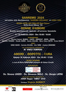 Il 9 e il 10 Febbraio 2024, durante la settimana del Festival della Canzone Italiana, presso il Grand Hotel Des Anglais in Sanremo, nell’ambito del “Sanremo Exclusive” di Guido Faro, si terranno gli Eventi “donne d’amore” premio dedicato all’universo femminile e al contrasto alla violenza sulle donne e “ amore – rispetto – cura” per la sensibilizzazione alla prevenzione dei tumori al seno, ideati ed organizzati dall’Associazione Naschira, partner di Barrett international group di Virginia Barrett.
