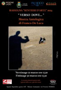 Inaugura venerdì 22 marzo alle ore 17.30 la mostra del fotografo e poeta Franco De Luca, intitolata “Verso dove…” presso lo spazio espositivo del punto IAT del Comune di Formia. Un’ esposizione antologica dell’arte fotografica “surreale” dell’83enne artista formiano. È il sesto appuntamento della Rassegna “Sentieri d’Arte 2024” promosso dall’associazione culturale Koiné in collaborazione con la pinacoteca Comunale “Antonio Sapone” di Gaeta, l’Ufficio informazioni e accoglienza turistica, la Pro Loco e gli Assessorati alla Cultura e al Turismo del Comune di Formia. Il Vernissage è previsto per le ore 17.30 del 22 marzo, il finissage per la stessa ora del 30 marzo. L’Evento è un omaggio alla figura dell’artista scomparso di recente e alla sua Arte di ricerca, ricca di collaborazioni. La mostra presenterà una selezione delle opere di Franco De Luca degli ultimi dieci anni, offrendo così uno sguardo privilegiato sulla sua produzione più recente. Questo straordinario artista, poliedrico e raffinato, ha saputo distinguersi sia nell’arte poetica che visuale, con opere che oscillano tra l’innocenza e l’ironia, tra la profondità e la leggerezza.