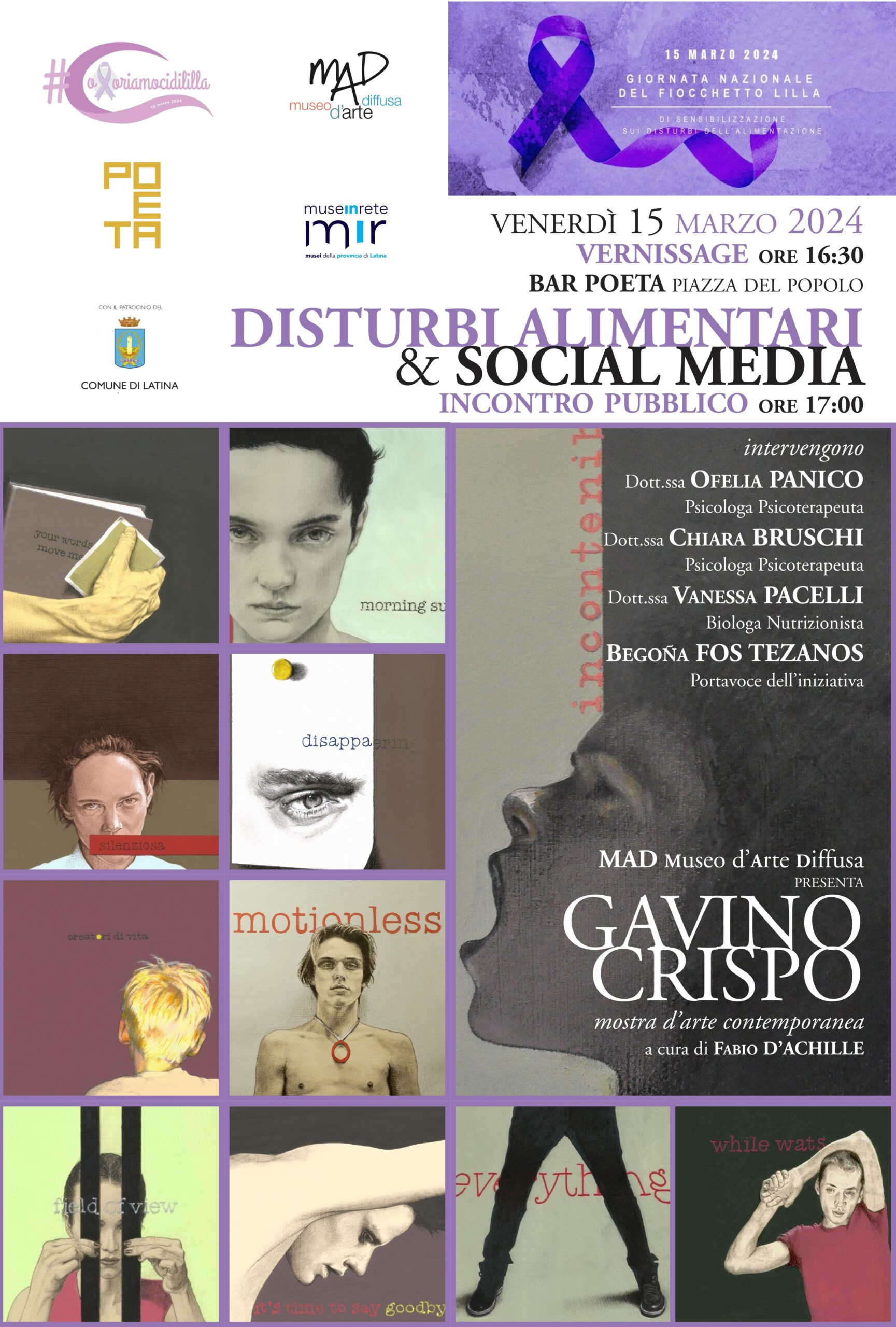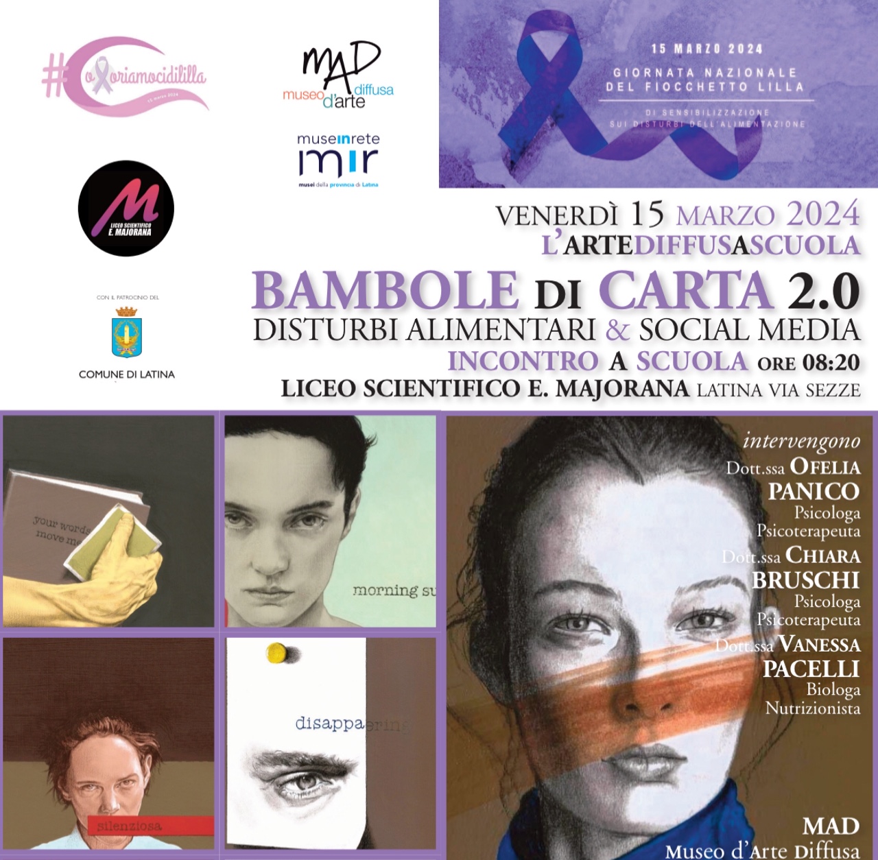 È simbolo di speranza per chi per troppo tempo è rimasto costretto in silenzio e in solitudine dalla sofferenza, il fiocchetto lilla serve per restituire voce e dignità a chi pensava di averle per sempre perdute. È inoltre simbolo del ricordo, per non dimenticare chi non ce l’ha fatta. Una comunità d’intenti, per costruire una nuova cultura fondata sull’ascolto, che abbatte il muro dei pregiudizi per lasciare spazio alla forza della condivisione. Insieme alla Dott.ssa Vanessa Pacelli Nutrizionista, Chiara Bruschi e Ofelia Panico Psicologa-Psicoterapeuta, Mad Museo d’Arte Diffusa invita tutti a partecipare all’evento che unisce arte e informazione. L’incontro è aperto a tutti e gratuito. Si svolgerà la mattina nella Aula Magna del Liceo Scientifico E. Majorana di Latina con una breve presentazione della mostra d’arte contemporanea di Gavino Crispo a cura di Fabio D’Achille e proseguirà con gli interventi delle esperte nutrizioniste e psicologhe con un dialogo aperto con gli studenti e le studentesse divisi in classe e in tre gruppi di due ore circa.