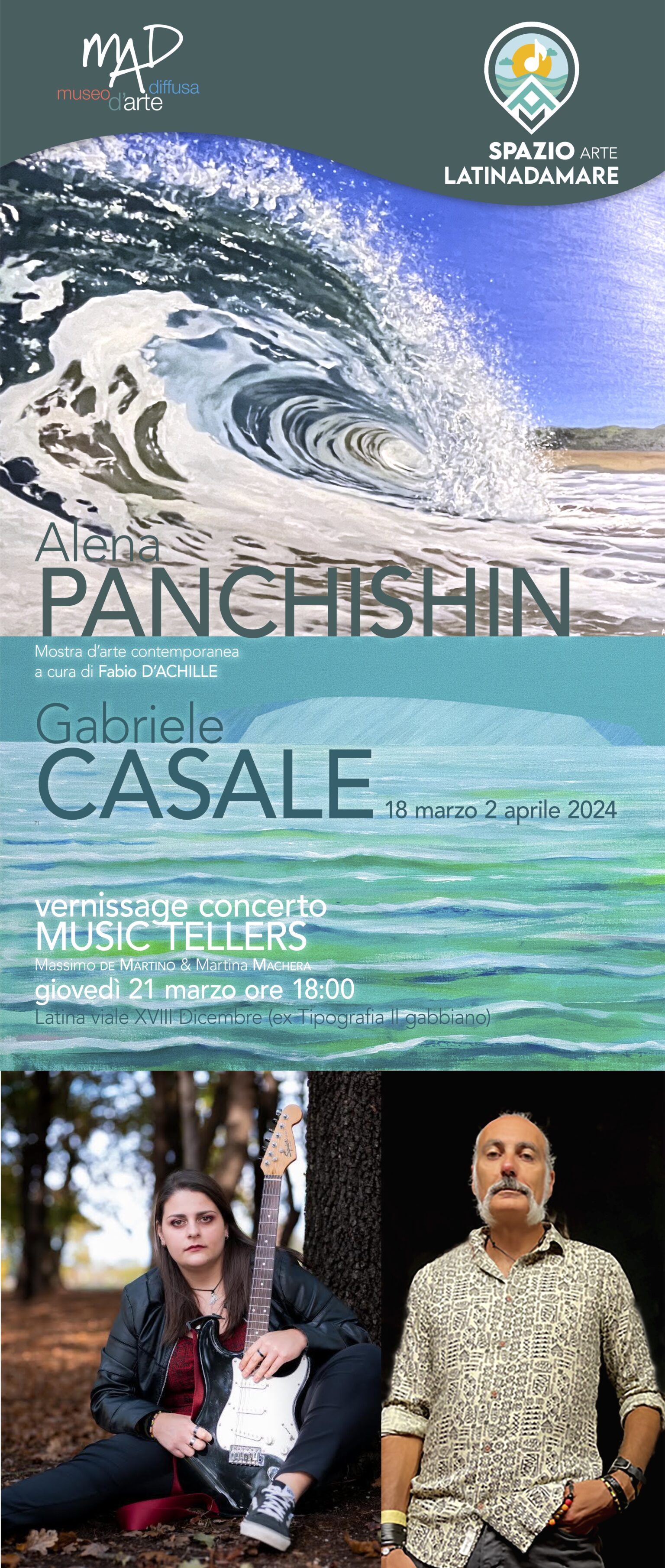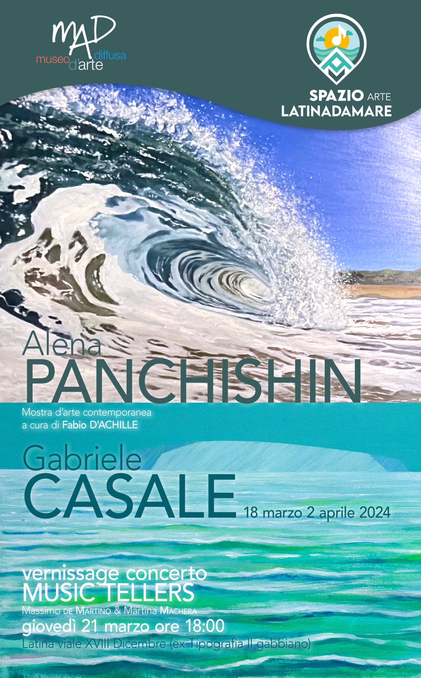 La sua vera suggestione è quel maniacale racconto della luce, dello specchio d’acqua, dei lapilli delle onde siano esse immense o dolci carezze sulla sabbia del nostro litorale. Sfuggita ad una guerra con la figlia Eva, Alena racconta che arrivare qui a Latina in Italia a 5 minuti dal mare è stato quasi incredibile. Doveva fare 7 ore di treno da Dinipro per vedere il mare ucraino e godere di questo dono della natura. Gabriele ha già esposto con Alena l’estate scorsa con Mad alla Casa di quartiere di Latina Scalo e sempre con Massimo de Martino si è celebrata la sinestesia di Musica e Arte. Infatti nello spazio espositivo Massimo in duo con la giovane nipote performa dal vivo con le più belle canzoni italiane in una sorta di lezione concerto sulla musica d’autore. Ingresso libero e angolo bar disponibile dalle 18:00 alle 20:00. L’esposizione a cura di Fabio D’Achille si può visitare dal lunedì al venerdì dalle 10:00 alle 16:00 fino al 2 aprile.