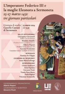 Un evento risalente a 572 anni fa che ora è oggetto di una giornata di studi promossa da Comune di Sermoneta, Unitre Sermoneta e Fondazione Roffredo Caetani, nell’ambito della rassegna “Incontri di marzo” predisposta dall’amministrazione comunale. L’appuntamento è per sabato 23 marzo alle ore 9.30 al Castello Caetani. I saluti istituzionali sono affidati al sindaco Giuseppina Giovannoli, al presidente della Fondazione Roffredo Caetani Massimo Amodio, al comandante della stazione carabinieri di Sermoneta luogotenente Antonio Vicidomini e al presidente di Unitre Sermoneta Alberto Raponi. Gli interventi, che saranno introdotti dal dottor Raniero De Filippis e coordinati dalla prof. Anna Maria Fallongo, saranno a cura di Chiara Andreotti, Anna Esposito, Giovanni Pesiri, Tomàs Pinto Bravo, Paolo Raponi e Vincenzo Scozzarella. La storia racconta che il 19 marzo 1452 il Papa incoronò Federico III, ultimo imperatore insignito a Roma. La cerimonia si svolse nel Ponte Sant’Angelo e lo stesso pontefice volle fortemente alla cerimonia il duca Onorato III Caetani di Sermoneta. Fu proprio onorato, al termine della cerimonia, a invitare il neo imperatore al castello di Sermoneta come ospite a un ricevimento in suo onore. Federico III giunse insieme alla sposa Eleonora di Portogallo il 25 marzo con un seguito di 5.000 persone e rimase a Sermoneta fino al 27 marzo, quando proseguì il viaggio verso Napoli.