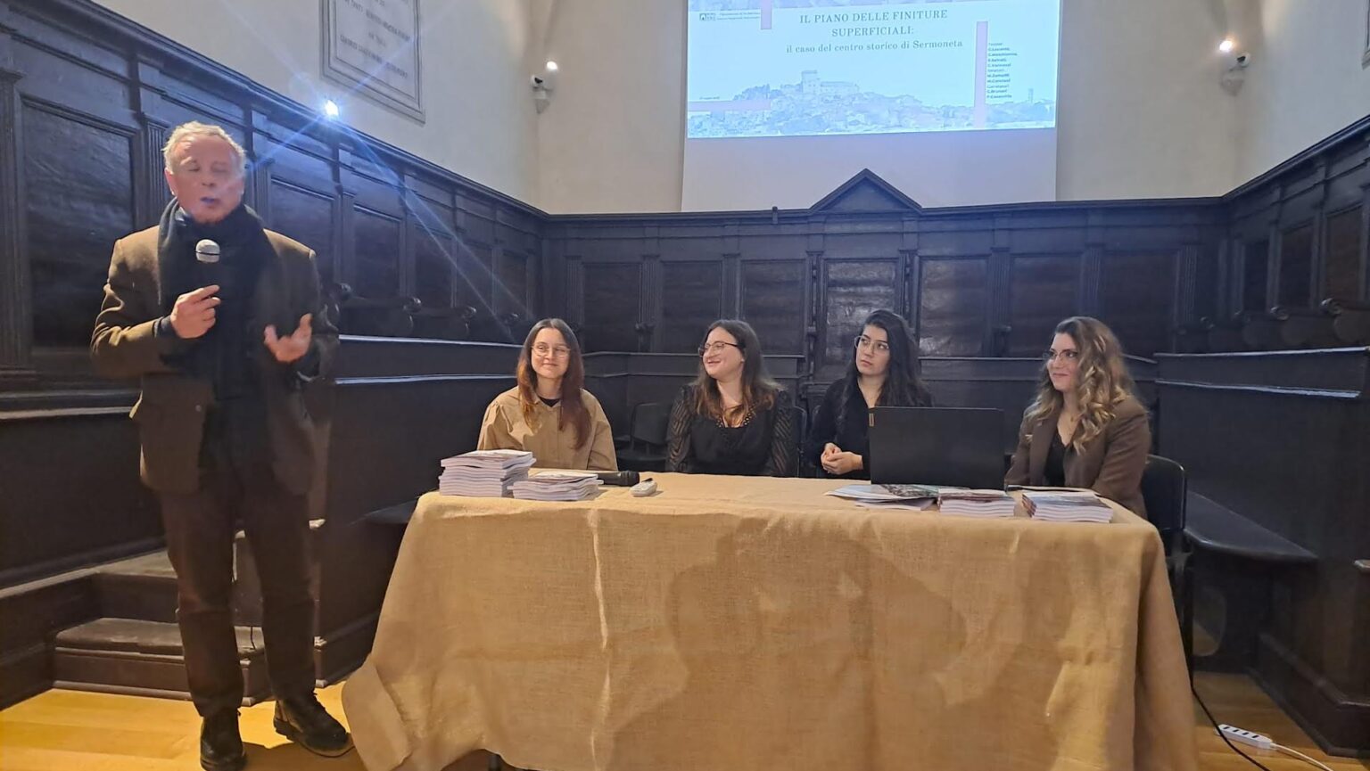 Nella seconda parte dell’evento è stata inaugurata la mostra sul lavoro di tesi magistrale in Architettura – Restauro presso il Dipartimento di Architettura dell’Università degli Studi di Roma Tre, dal titolo “Il piano delle finiture superficiali: il caso del centro storico di Sermoneta”. La presentazione è stata condotta dai relatori della tesi, i professori Michele Zampilli e Marco Canciani, insieme alle architette Chiara Loconte, Carmen Melchionna, Silvia Salvati e Chiara Vannozzi. L’iniziativa ha rappresentato un ulteriore frutto della collaborazione in corso da circa tre anni tra il Dipartimento di Architettura e l’amministrazione comunale di Sermoneta e si è giovata della presenza del Presidente dell’Ordine degli Architetti di Latina Massimo Rosolini, del Presidente del Rotoract Club di Latina Mariano Macale e del coordinatore del Dottorato Architettura: innovazione e patrimonio Valerio Palmieri.