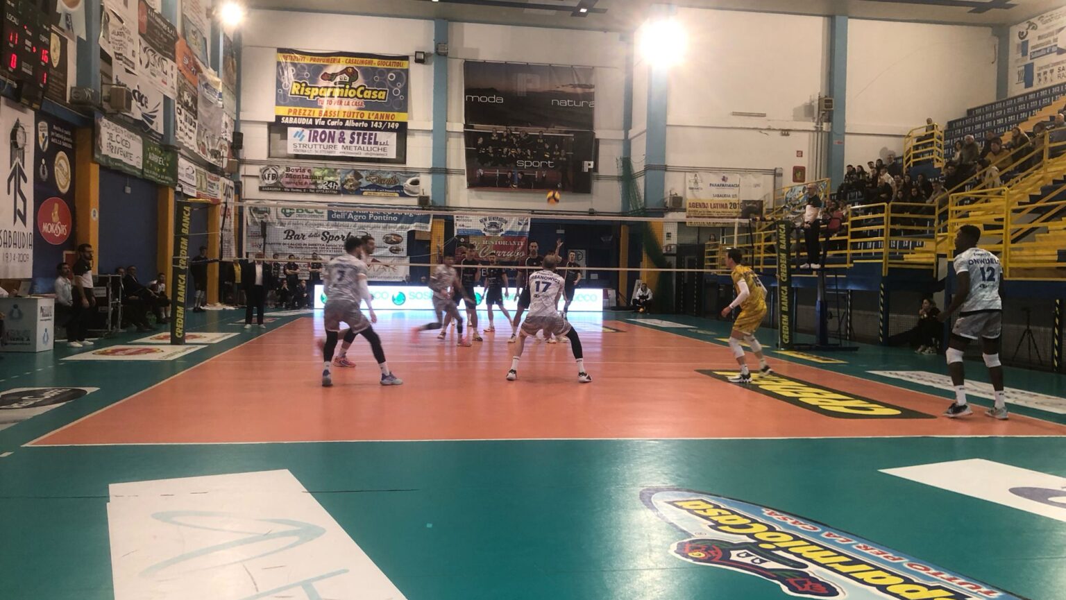 Inizio set favorevole agli ospiti, più ordinati con le idee ben chiare, Sabaudia parte con il piede sbagliato, concede troppo e commette anche qualche errore di ingenuità, 3-7, coach Mosca chiama time out. Sabaudia prova a recuperare, Catinelli riesce a smarcare agilmente Onwuelo e Urbanowicz, 10-13, poi alcuni errori favoriscono di nuovo la fuga degli ospiti, 10-16. Rondoni difende e recupera palle preziosissime, Ferenciac due volte a punto da posto due, 16-19. Lagonegro si aggiudica il primo parziale, 21-25.
