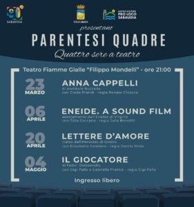 La programmazione proseguirà sabato 20 aprile con Lettere d’amore, protagonista Elisabetta Femiano diretta da Danilo Proia, per ultimarsi il 4 maggio con Il Giocatore in un’interpretazione di Gigi Palla e Gabriella Praticò, per la regia di Gigi Palla. Tutti gli appuntamenti sono a ingresso libero grazie al sostegno di attività ricettive e commerciali anche apparentemente concorrenti che hanno investito nella rassegna, concorrendo ad alimentare il dinamismo e favorire la crescita del tessuto culturale e sociale territoriale attraverso una programmazione teatrale in grado di generare molteplici esternalità, in cui interessi diversi si trovano a essere coinvolti, con ricadute positive per la qualità della vita della città e per le attività in essa presenti.