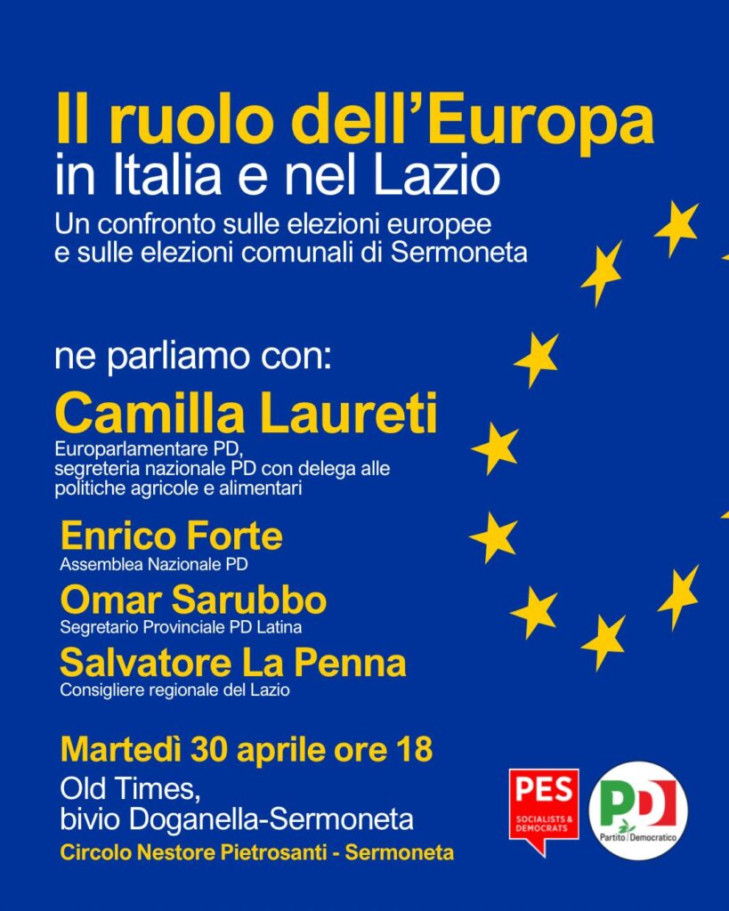 Per questo il PD di Sermoneta, circolo Nestore Pietrosanti, ha promosso insieme alla federazione prov.le un incontro con la parlamentare Europea Camilla Laureti.