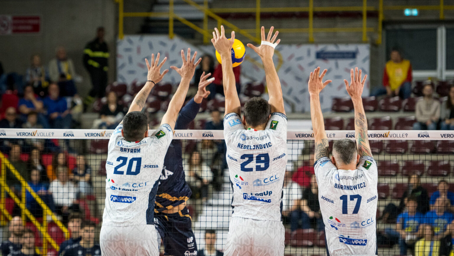 Dopo il rimescolamento di carte del parziale precedente, in avvio di terzo set Falasca schiera Baranowicz in palleggio opposto a Faure, bande Peric e Ramon, al centro Mazzone e Rossi con Finauri libero. L’inizio è tutto di Verona (4-2, 7-4 e 9-5) ma Cisterna impatta sul 9-9 grazie al turno al servizio di Baranowicz. Peric trova l’11-11 e Mazzone piazza il monster block del sorpasso (11-12). I pontini crescono dalla linea dei nove metri fino al 13-15 con l’ace di Peric ma Verona risponde e sorpassa (16-15) fino al 19-17 e Cisterna resta comunque in scia dei padroni di casa (20-19 e 23-21). Sul 24-21 Keita sbaglia il servizio e si annulla da solo il match point, poi Ramon mura Amin e annulla il secondo punto del match (24-23), Mozic attacca fuori da posto quattro (24-24) e si arriva ai vantaggi con Verona che chiude 27-25.