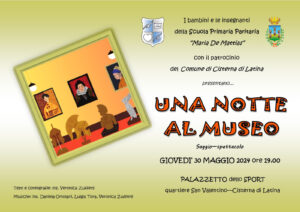 I bambini e le insegnanti della Scuola Primaria Paritaria “Maria De Mattias”, con il patrocinio del Comune di Cisterna di Latina, presentano il saggio-spettacolo “Una notte al museo”, giovedì 30 maggio dalle ore 19 nel Palazzetto dello Sport del Quartiere San Valentino. Testi e coreografie a cura dell’insegnante Veronica Zufferli, musiche a cura delle insegnanti Daniela Ortolani, Luigia Tora e Veronica Zufferli.