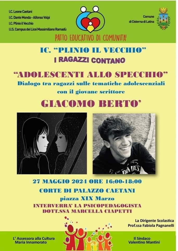 Oggi 27 maggio, dalle ore 16.00 alle 18.00, i ragazzi e le ragazze delle classi terze della secondaria di primo grado dell’istituto comprensivo “Plinio il Vecchio” incontreranno il giovane scrittore Giacomo Bertò nella Corte di Palazzo Caetani, insieme agli studenti delle altre scuole di Cisterna.
