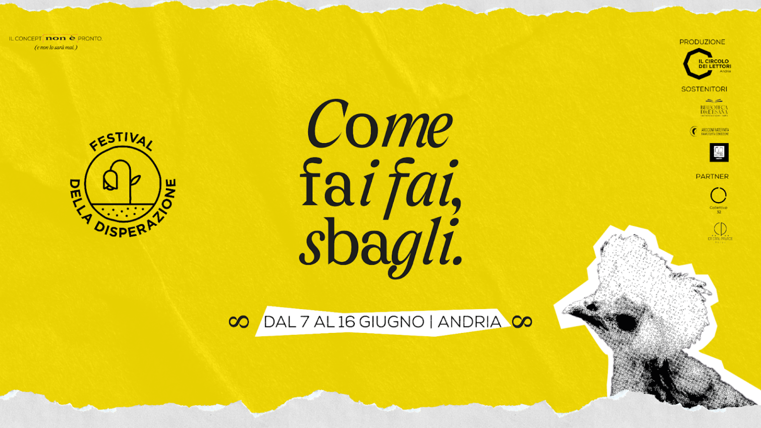 Torna per l’VIII edizione il festival culturale che, con risvolti ironici, celebra il potere trasformativo (e catastrofico) della disperazione nella letteratura e nella vita moderna. Dieci giorni di talk, incontri, conferenze e spettacoli: torna ad Andria il Festival della Disperazione. “Come fai fai sbagli” questo il tema scelto per l’VIII edizione che avrà appunto come soggetto l’errore in tutte le sue forme e contraddizioni, a partire da quelli che facciamo nel nostro quotidiano fino ad arrivare all’attualità sociale e politica: l’evento – organizzato dal Circolo dei Lettori di Andria – si terrà dal 7 al 16 giugno 2024 presso il Seminario Vescovile. L’unico appuntamento culturale del nostro Paese che celebra il potere trasformativo e catastrofico della disperazione (il sentimento letterario per eccellenza) nella letteratura e nella vita moderna, il festival porterà anche quest’anno nella cittadina pugliese scrittori, attori, giornalisti, musicisti e artisti. Con tanto umorismo, ma senza mancare di serietà, sono molti i protagonisti che si daranno appuntamento ad Andria: dal giornalista Saverio Tommasi alla linguista Vera Gheno, dalla filosofa Ilaria Gaspari al rapper Ghemon, e poi ancora Nicola Lagioia, Vito Mancuso, Irene Soave, Claudio Morici, Mauro Covacich, Chiara Tagliaferri, Guido Vitiello, Lucrezia Ercoli, Roberto Mercadini, Francesca Coin, Antonio Pascale, Niccolò Fettarappa e Lorenzo Guerrieri, e tanti altri e altre. “Come fai fai sbagli è la condizione con cui ci avviciniamo a questa ottava edizione del Festival della Disperazione. Una condizione che, oltre a caratterizzare e rappresentare al meglio lo spirito e l’essenza del festival, rappresenta un po’ la condizione di tutti noi che, ogni giorno le proviamo tutte per raggiungere i nostri piccoli grandi obiettivi sbagliando sistematicamente ogni singola scelta che facciamo.” Ha dichiarato il direttore artistico Gigi Brandonisio, che ha aggiunto: “L’errore, in tutte le sue forme, è la cosa che ci riesce meglio, quella che puntualmente non sbagliamo mai. E allora partiamo dalla consapevolezza che tanto ogni sforzo è inutile, che tanto qualcosa andrà storto. L’ottava edizione del Festival della Disperazione la vivremo con questa consapevolezza: in attesa di confrontarci con i nostri sbagli quotidiani. Con o senza errori proveremo anche questa volta a sopravvivere, sapendo che non sarà per niente facile.” Il Festival è ideato e organizzato dal Circolo dei Lettori di Andria. Si ringrazia per il sostegno la Biblioteca Diocesana San Tommaso D’Aquino, l’Arciconfraternita Immacolata Concezione e i Presidi del Libro e per la collaborazione i partner Cristal Palace Hotel e Collettivo 32.