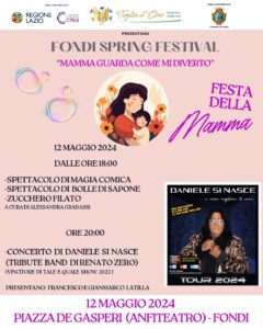 Grande attesa a Fondi per il primo appuntamento del Fondi Spring Festival, kermesse finanziata dalla Regione Lazio – Lazio Crea e organizzata dalla Soc. Coop. Foglia D’Oro Onlus con la collaborazione e il contributo del Comune di Fondi, che coincide con la Festa della Mamma. La prima data della manifestazione che celebra la stagione del clima mite, le giornate sempre più lunghe e la fioritura della natura sarà quindi dedicata alle famiglie.