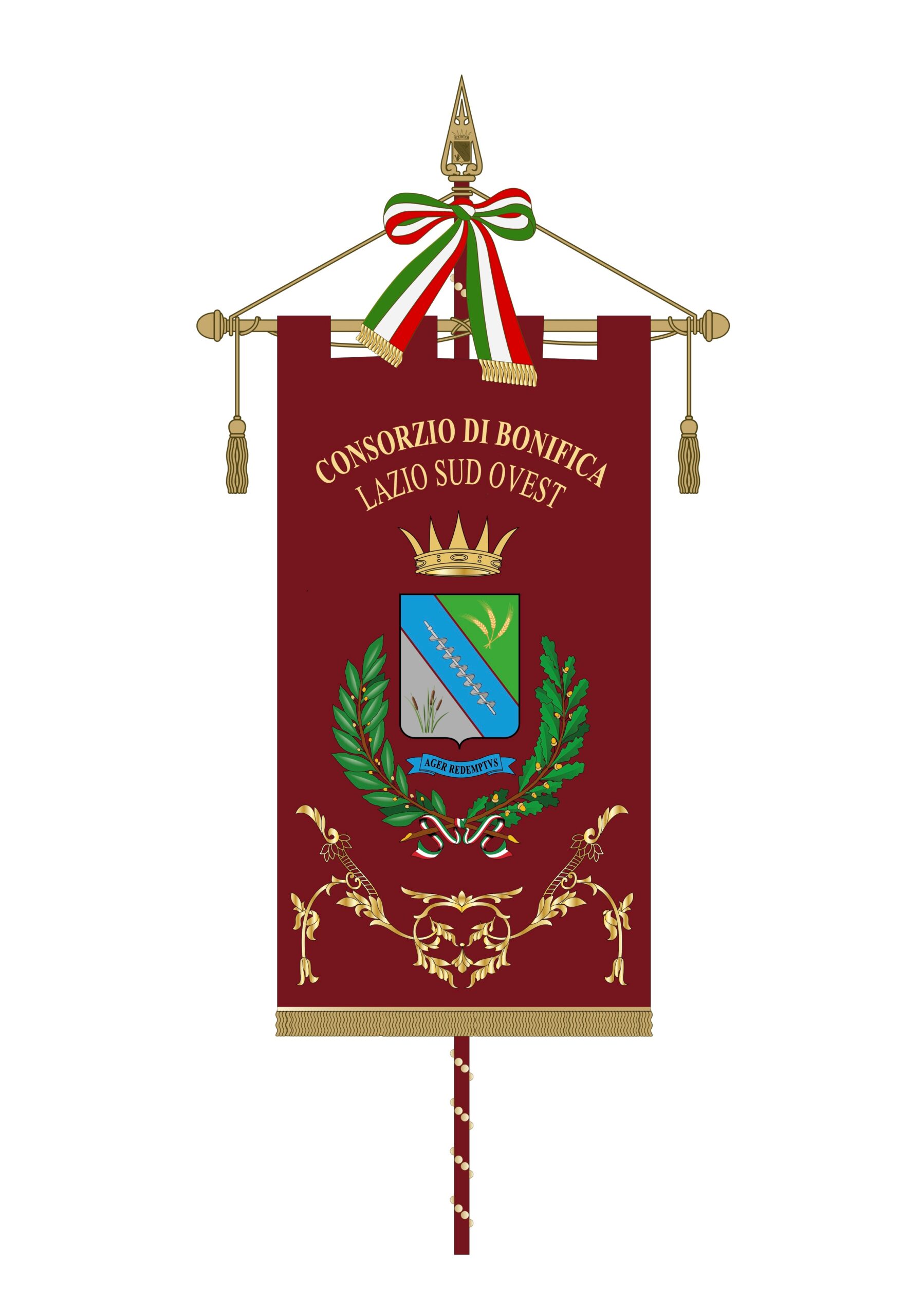 Da qui l’idea di proporre la realizzazione dello stemma e degli emblemi araldici: bandiera e gonfalone, quale formale coronamento del percorso istituzionale del nuovo ente, istituito dalla fusione dei preesistenti Consorzi di Bonifica Agro Pontino e Sud Pontino. Lo stemma è diviso in tre partizioni funzionali a scandire le fasi della bonifica idraulica integrale: le tre spighe di grano intrecciate che rappresentano lo stato attuale del territorio; la partizione centrale (banda) rappresenta la c.d. vite di Archimede, o còclea, in quanto archetipo della macchina idraulica sul cui principio ancora oggi funzionano le idrovore. Il campo azzurro rappresenta l’acqua. L’origine paludosa del territorio è sugellata dalla figura araldica della canna di palude, tipica essenza di quell’eco-sistema ed il campo argenteo simboleggia i riflessi dell’acqua stagnante.