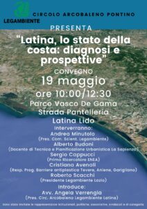 Il Circolo Arcobaleno Pontino della Legambiente promuove un incontro pubblico domenica 19 maggio dalle ore 10,00 alle ore 12,30 presso il Parco Vasco De Gama sito in via Pantelleria a Latina Lido.