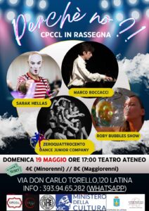 Gran finale per la rassegna “Perché no”, primo frutto della partnership tra l’Ateneo delle Arti di Latina, diretto da Valentina Zagami e il Centro Produzione Circo Contemporaneo Lazio diretto da Alberto Longo. Appuntamento domenica 19 maggio, alle ore 17.00, nell’auditorium di via don Carlo Torello 120 a Latina. Sul palco due artisti che faranno rivivere la magia del circo contemporaneo. Da una parte Sarak Hellas, all’anagrafe Alessandro Salvatori, che porterà in scena un mimo impertinente, goliardico, che si diverte e improvvisa coinvolgendo direttamente il pubblico nel suo show scapestrato e surreale. Dall’altra Roberta Tirocchi, con il suo Roby bubbles show: uno spettacolo maestoso che si rivela come un balletto incantato in cui la magia danza tra le dita: piccole bolle che si celano nelle grandi, bolle fumose che fluttuano nell’aria e bolle profumate che stregheranno il