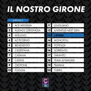 L’Atalanta U23 è stata inserita nel girone A, mentre la novità Milan Futuro giocherà nel girone B. Questa la composizione completa del girone del Latina: ACR Messina, Audace Cerignola, Avellino, AZ Picerno, Benevento, Casertana, Catania, la neopromossa Cavese, Crotone, Foggia, Juventus Next Gen, Latina, Monopoli, Potenza, Sorrento, le altre neopromosse Team Altamura e Trapani e conclude il girone la Turris.