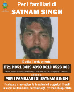 presso il Tesoriere Comunale – Banca Popolare del Lazio – Agenzia 1 di Velletri. Chiunque, pertanto, può devolvere fondi a sostegno della famiglia del bracciante agricolo che abitava a Cisterna di Latina, rimasto vittima di un gravissimo incidente mentre era al lavoro in un’azienda agricola alle porte del capoluogo di provincia, e che sarebbe deceduto a causa del mancato soccorso. Un fatto che, per le modalità e vicissitudini in cui si è svolto, ha destato sgomento, dolore e ferma condanna in tutta la comunità cisternese, d’Italia e anche all’estero, essendo stata la notizia di cronaca riportata anche dai media internazionali. Volendo interpretare il desiderio della comunità locale di dimostrare vicinanza e solidarietà, è stato attivato il conto corrente per la raccolta fondi con la specifica causale “Per i familiari di Satnam Singh”.