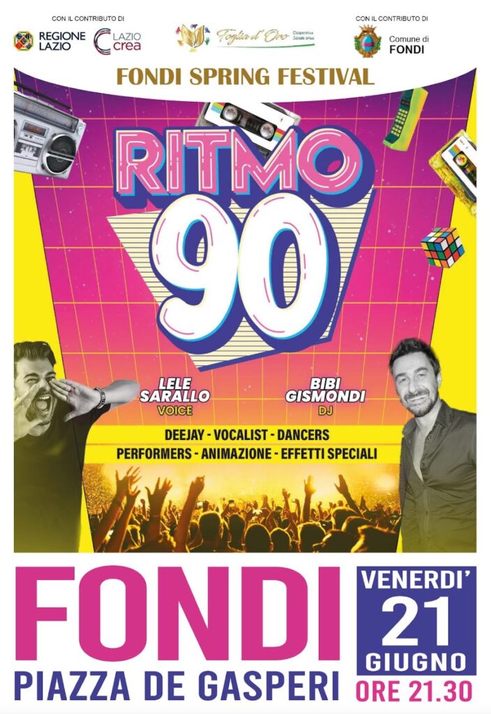 Dopo il grande successo della Festa della Mamma, il programma prosegue con “Ritmo 90”: serata dedicata alle hit storiche e ai più grandi successi dell’epoca. Musica e divertimento in Piazza De Gasperi, quindi, che venerdì 21 giugno per qualche ora farà un viaggio indietro nel tempo al ritmo dei brani più amati degli anni Novanta. L’appuntamento è a partire dalle 21:30.