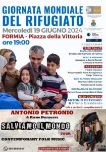 A seguire, il concerto di Antonio Petronio & Ritmo Dissidente, che per l’occasione faranno tappa a Formia con la tournée 2024 “Salviamo il Mondo”. La band del basso Lazio metterà in scena un concerto innovativo che fonde il folk con il pop, la musica popolare con elementi di reggae, funky e rock. L’accesso all’evento è gratuito e aperto a tutti. Per il secondo anno consecutivo, la Cooperativa Diaconia ha scelto il Comune di Formia per raccontare il tema dell’accoglienza attraverso testimonianze, storie d’integrazione e musica. Diaconia infatti dal 2021 nella città pontina gestisce con successo un progetto di accoglienza SAI grazie alla collaborazione con il Comune di Formia, la Prefettura di Latina e la Diocesi di Gaeta. Un