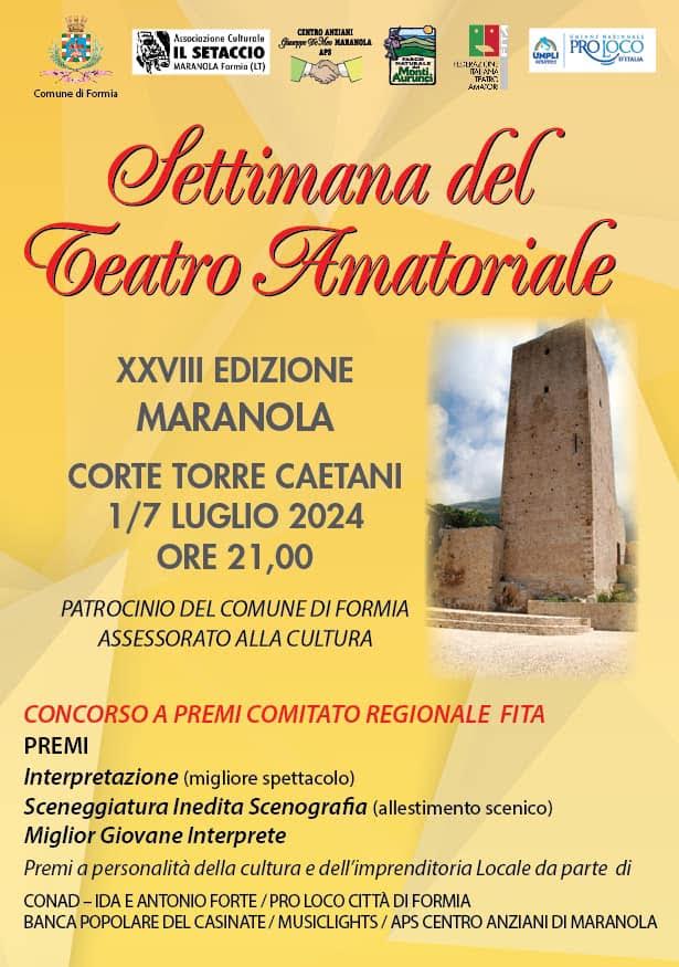 La XXVIII edizione della Settimana del Teatro Amatoriale di Maranola si svolge all’ombra dell’antica Torre Caetani nella sede del Parco Naturale Regionale dei Monti Aurunci. Come da programma alle ore 21.00 di lunedì 1° luglio a domenica 7 luglio 2024 si terranno gli spettacoli teatrali (l’ingresso è libero) selezionati tenendo presente i gusti del variegato pubblico.