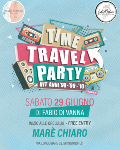 Dopo il grande successo della prima serata al Lido Tortuga di Gianola, il nuovo format di feste, Time Travel Party, ritorna per una seconda serata imperdibile. Questa sera, sabato 29, alle 22.30, l’evento si terrà a Marèchiaro – Lido Medusa, promettendo un’altra notte all’insegna del divertimento e della buona musica. Time Travel Party è un’esperienza unica che porta il clubbing in territori dove questo tipo di eventi è ancora assente. Il nostro obiettivo è quello di espanderci progressivamente in tutte le zone che non offrono questo genere di intrattenimento.