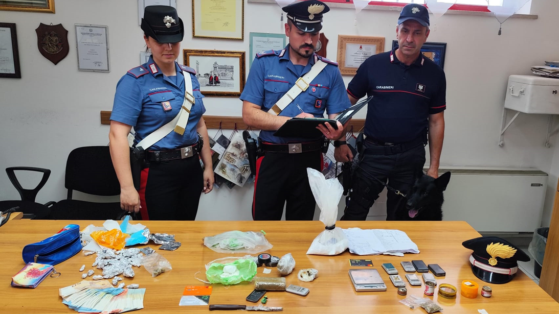 • uomo classe 90 residente a Priverno (LT), poiché trovato in possesso, in quanto occultati in vari arredi, grammi 31 circa, suddivisa in più dosi chiuse all’interno di cellophane trasparente, di sostanza stupefacente del tipo marijuana; grammi 46 circa, suddivisa in più dosi chiuse all’interno di cellophane trasparente, di sostanza stupefacente del tipo hashish; somma contante di euro 830,00 suddivisa in banconote di vario taglio; vario materiale per il confezionamento.