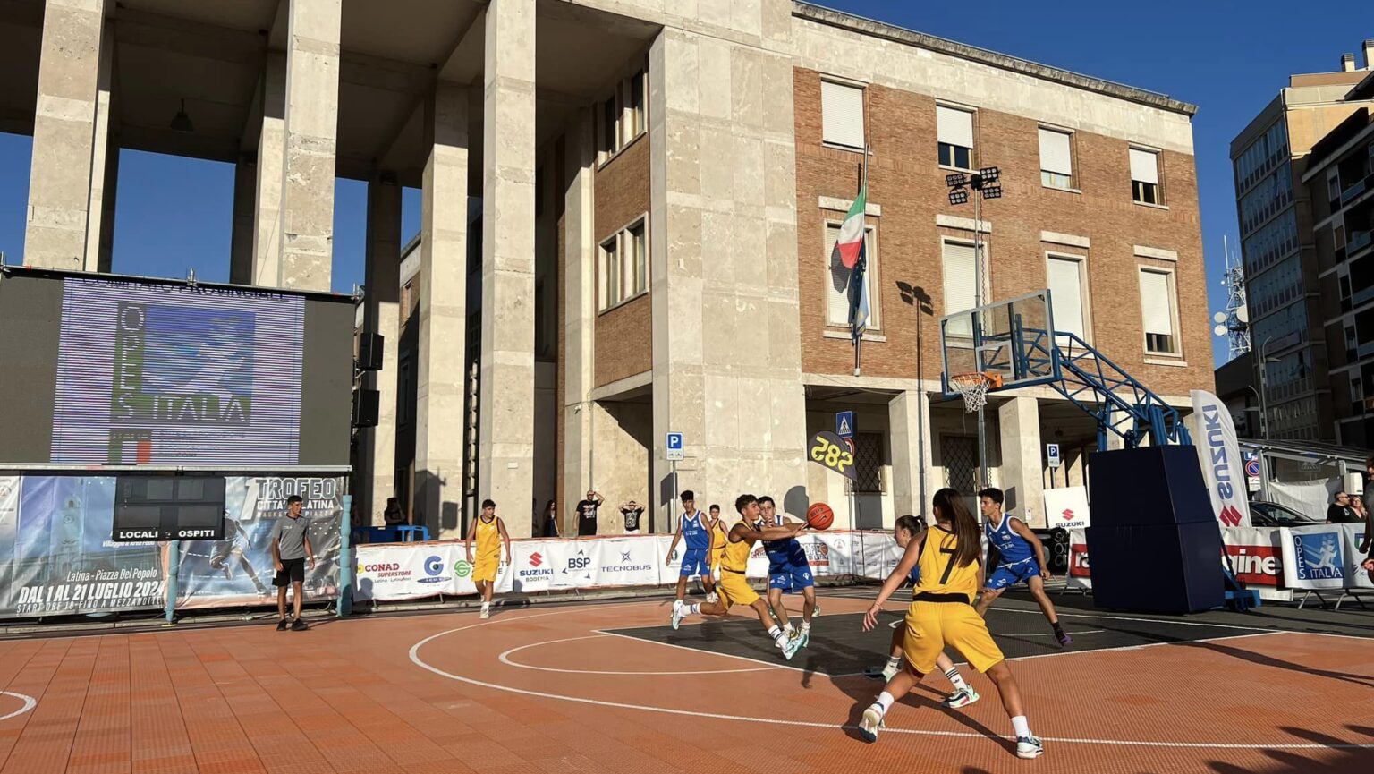Nella tribuna dell’arena di Piazza del Popolo anche il sindaco di Latina Matilde Celentano, presenza illustre nella quinta sera di BIP, Basket in Piazza nel I Trofeo Città di Latina. A fianco al primo cittadino Massimo Passamonti, presidente dell’associazione Gli Amici del Basket, promotrice dell’evento e Davide Fioriello, segretario nazionale OPES, vicino sin dall’inizio al progetto di riportare in piazza la pallacanestro. Sul campo altre due partite, che hanno richiamato l’attenzione di un folto pubblico. Si entra nel primo weekend del I Trofeo Città di Latina e il Basket in Piazza propone alle 19 la sfida Junior tra I Goonies e Globaltel, che hanno vinto la gara di apertura, e nei Senior il programma prevede, per il girone B, Farmacia Isonzo – Benacquista Assicurazioni.