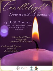 Domenica 14 luglio, a partire dalle ore 21:00, nello splendido scenario della terrazza del Castello Caetani a Fondi, si svolgerà l’evento ”Candlelight – Note a passo di Danza’‘. Organizzato dall’Associazione Culturale Musicinecultura, l’evento, alla sua prima edizione, coinvolgerà le arti della musica e della danza in un’armonica fusione che emozionerà il pubblico presente. L’appuntamento si aprirà con il benvenuto da parte di Fabiola Lauretti, presidente dell’Associazione culturale Musicinecultura che esporrà il lavoro dell’associazione. Dopo i saluti istituzionali ed una brevissima presentazione degli artisti, si inizierà con l’esecuzione delle melodie da parte del pianista Antonio Di Costanzo dell’Associazione Largo alla Musica. Si assisterà ad un viaggio itinerante che ripercorrerà 300 anni di storia della musica, con protagonista il pianoforte e la sua evoluzione stilistica fino ai giorni nostri. Intermezzi di danza aerea su tessuto di colore bordeaux, proposti da Sara Ventura, incanteranno il pubblico presente. Performance di grande professionalità la vedranno, infatti, impegnata in due distinti momenti nel corso dell’evento. Infine la luce soffusa delle numerose candele che circonderanno gli artisti creerà la giusta atmosfera capace di trasportare il pubblico in un vortice di magiche sensazioni. “Un evento ricco, stimolante e pieno di fascino attende la cittadinanza e i turisti presenti sul territorio – commentano gli organizzatori – siamo entusiasti che la nostra attività riempirà l’estate fondana di luci e colori”.
